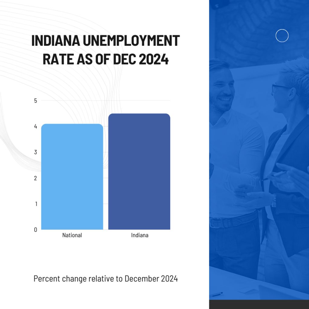 According to Indiana monthly employment reports, “The unemployment rate of the State of Indiana in December was recorded to be 4.5%, according to the Indiana Department of Workforce Development. By comparison, the national unemployment rate reported for December was 4.1%.
