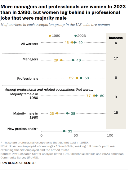 - Women continue to make up a large share of the 28 professional occupations where women were the majority of workers in 1980. In 2023, 80% of workers in these jobs were women, up from 77% in 1980. Some examples of majority-female occupations include registered nurses, teachers and social workers.